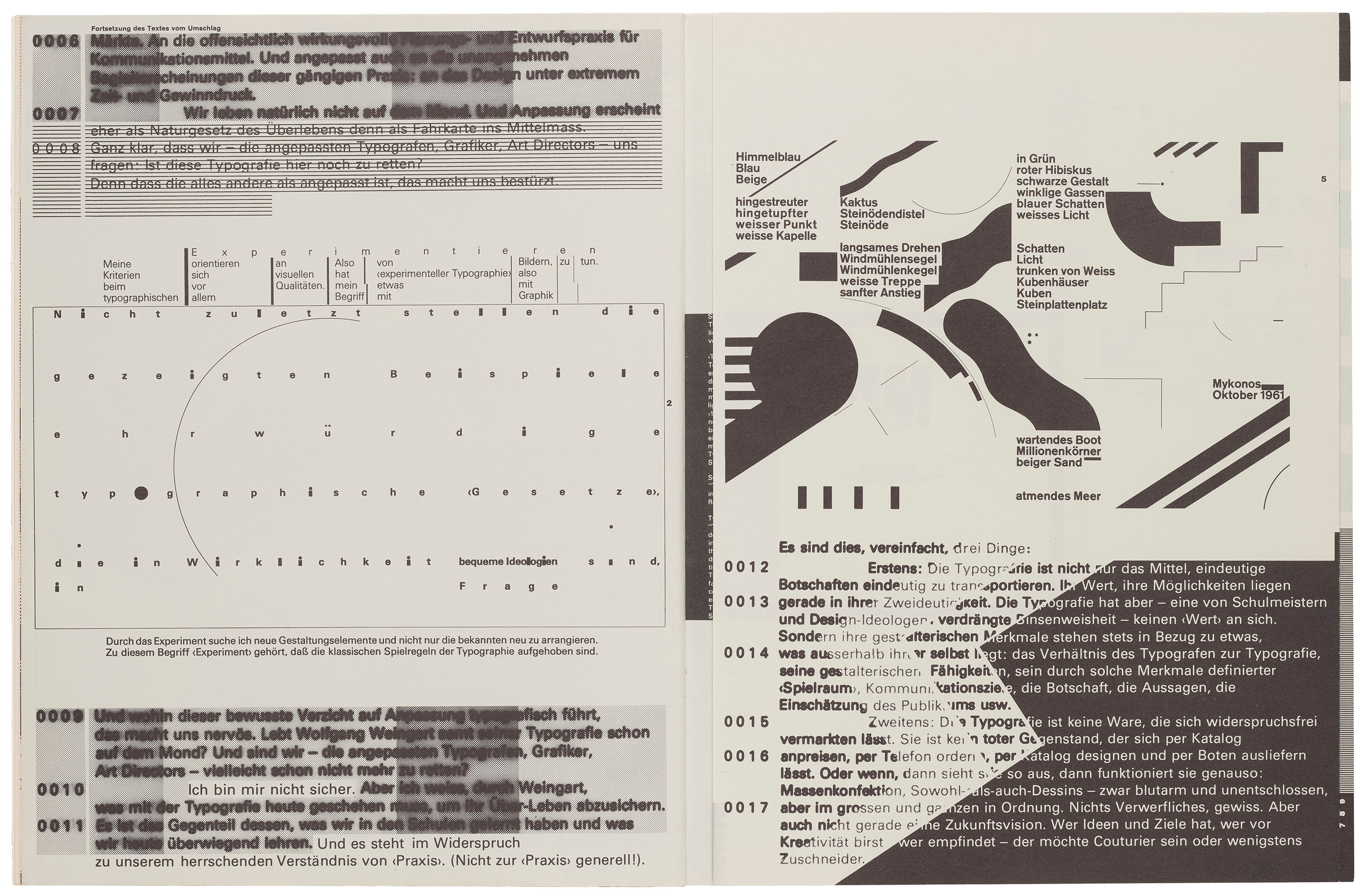 As demonstrated by his cover designs, Weingart was notorious for inhibiting the legibility of the text—an approach wholly incompatible with the established rules of Swiss design. For critics like Tschichold, who once described the work of emerging designers as “typographic barbarism,” Weingart’s renunciation of formal clarity was difficult to accept during a period when even the superfluous indent was considered an extravagance.2 Compared to the fully-resolved layouts that exemplify “good design,” Weingart’s compositions appear unfinished or even accidental, producing a visual tension some may find both seductive and unsettling.
