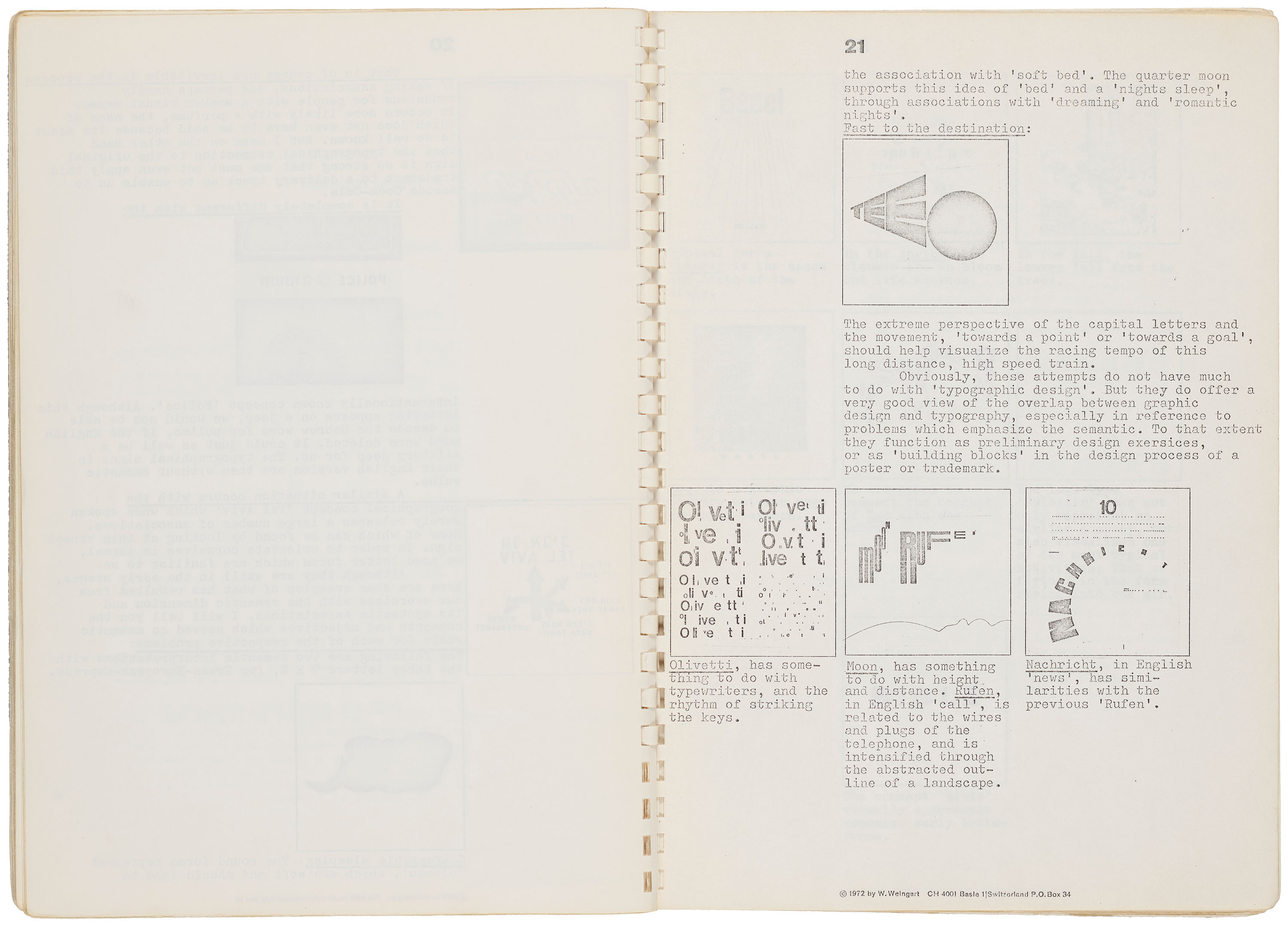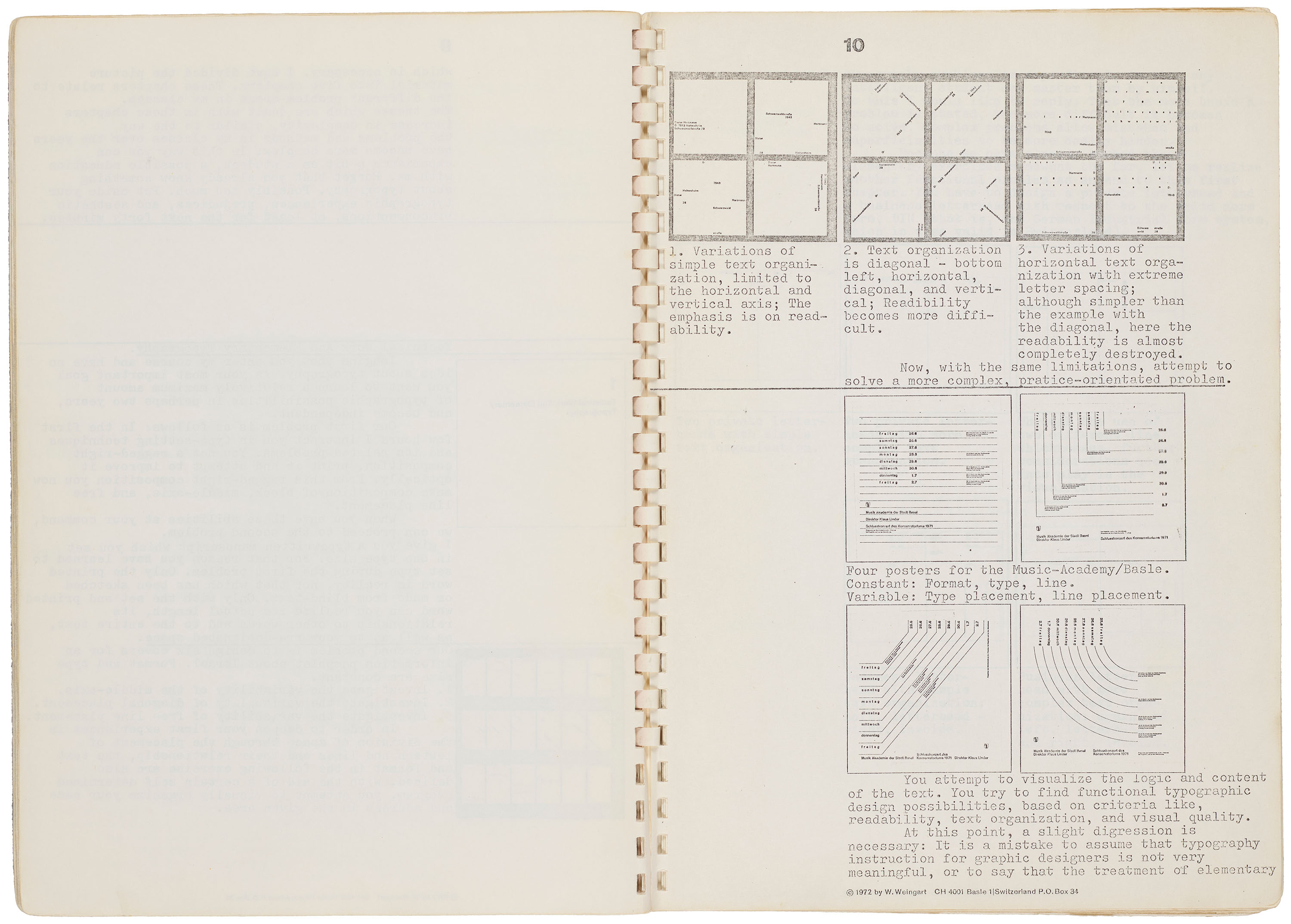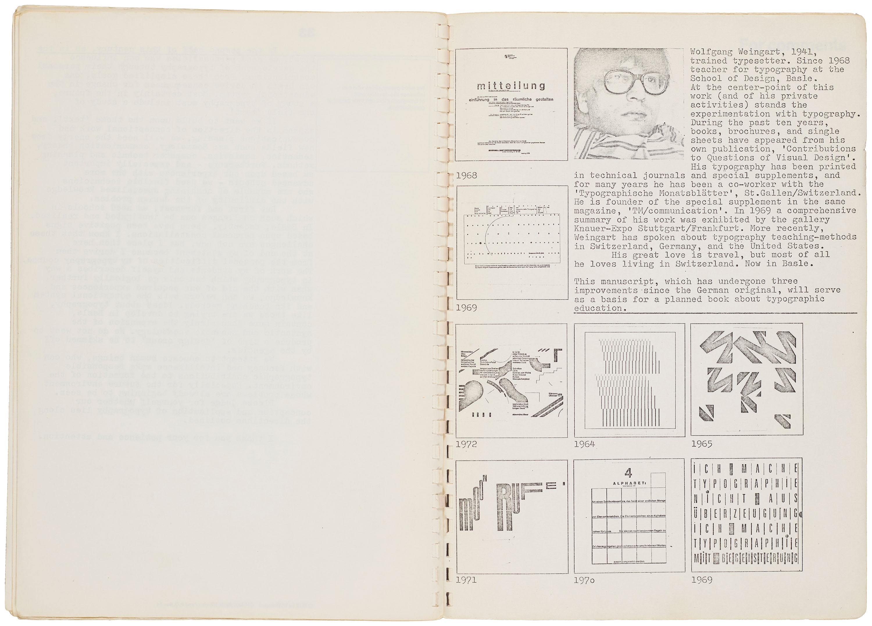 In a 1972 manuscript for a series of lectures delivered throughout the United States, Weingart addresses the impossible question: “How can one make Swiss Typography?” Noting that the term was already being redefined, he suggests “Swiss Style” consists of foundational principles that designers might learn well enough to question and adapt to their individual needs. By comparison, Ruder’s methodology, while similarly invested in process and experimentation, was oriented toward identifying objective solutions to design problems rather than examining the assumptions that sustained them.
