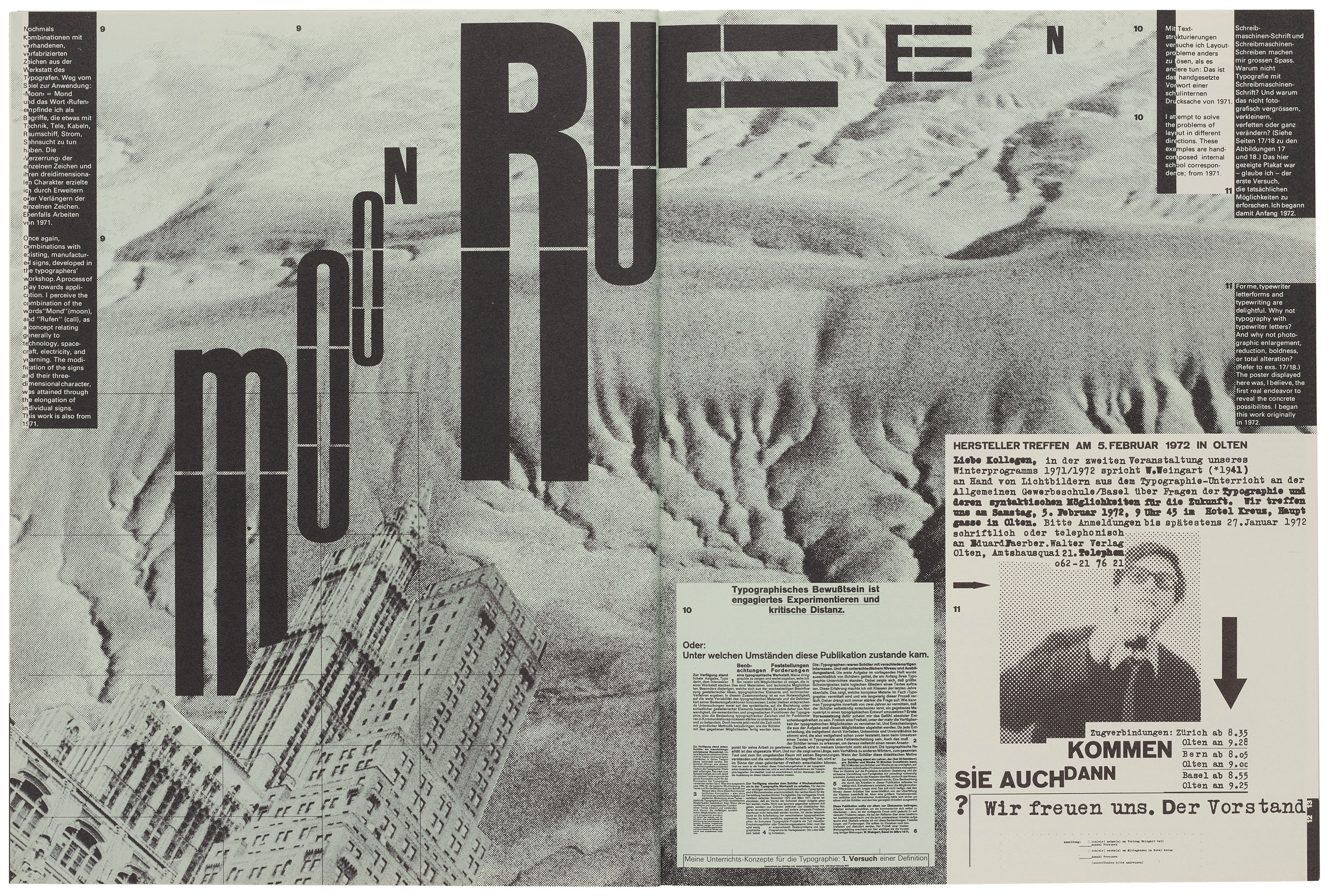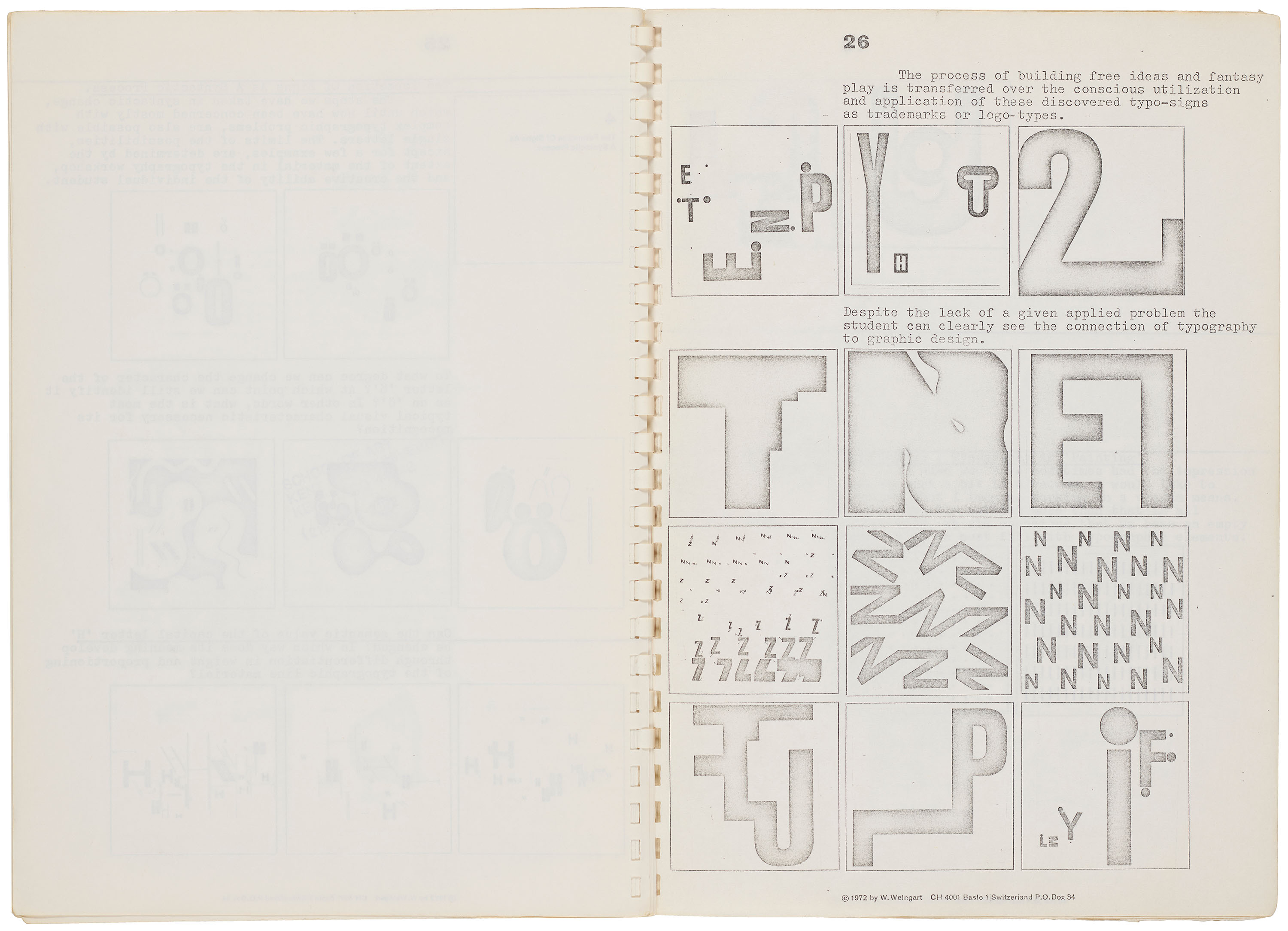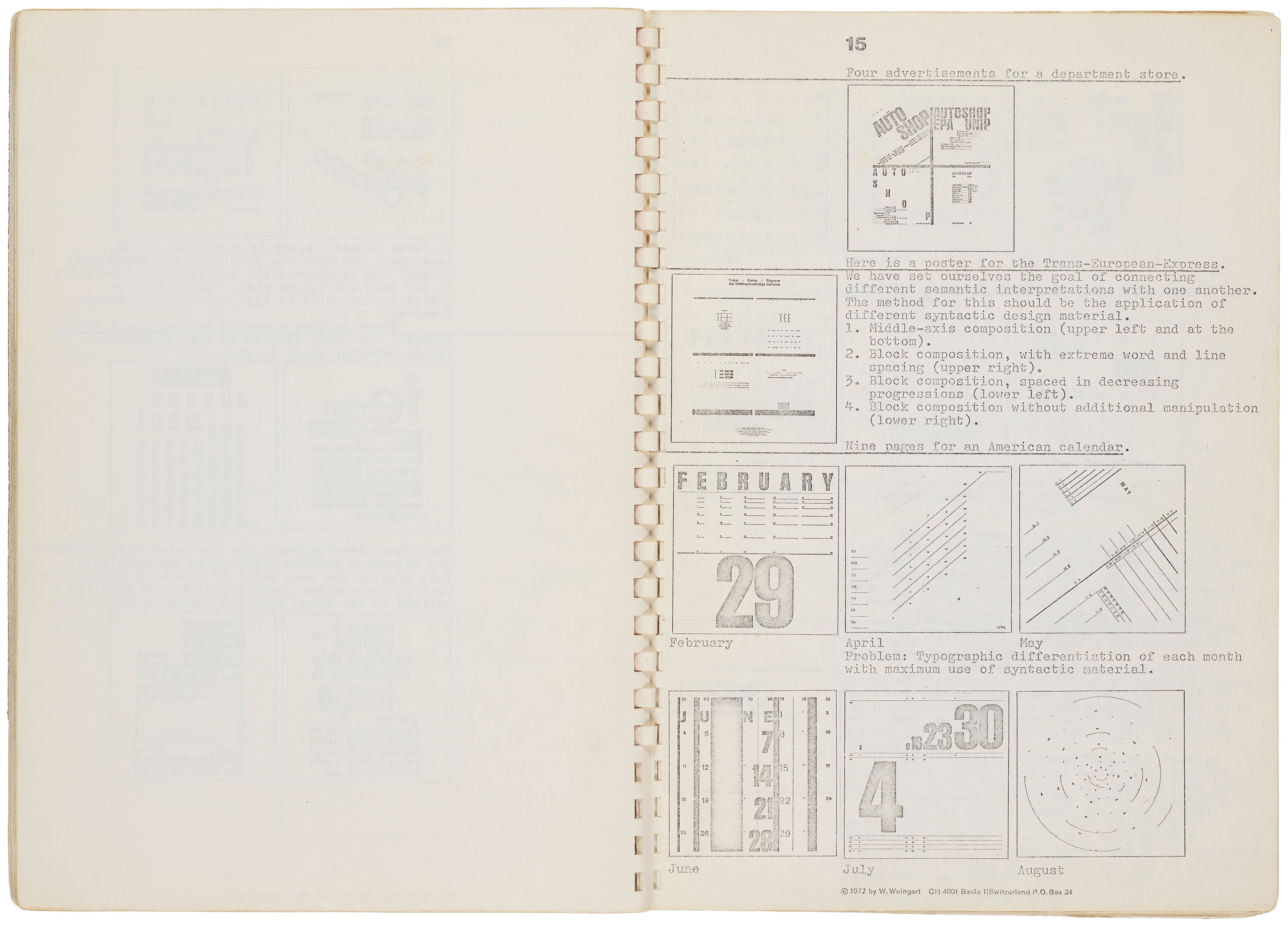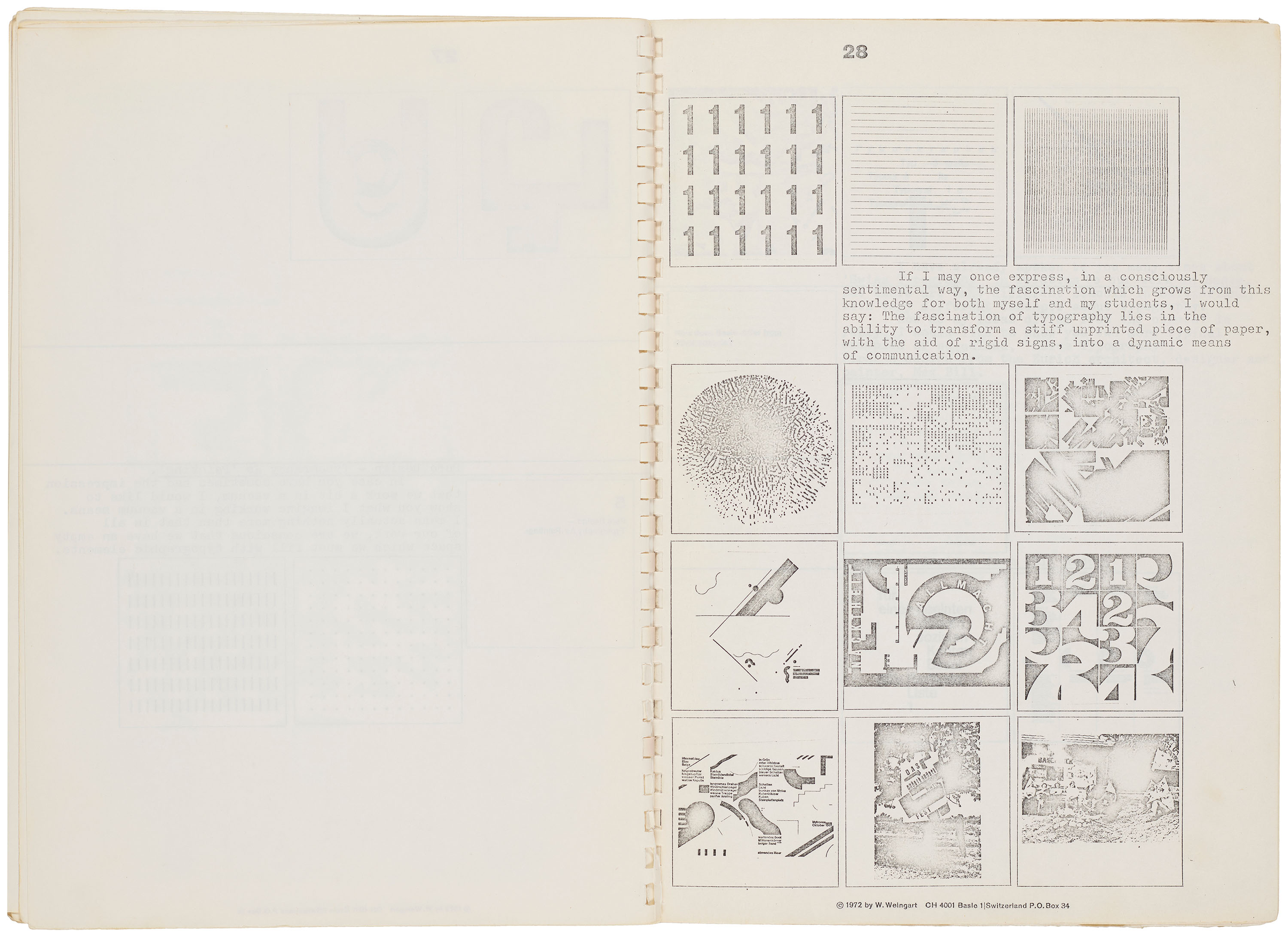 In a 1972 manuscript for a series of lectures delivered throughout the United States, Weingart addresses the impossible question: “How can one make Swiss Typography?” Noting that the term was already being redefined, he suggests “Swiss Style” consists of foundational principles that designers might learn well enough to question and adapt to their individual needs. By comparison, Ruder’s methodology, while similarly invested in process and experimentation, was oriented toward identifying objective solutions to design problems rather than examining the assumptions that sustained them.