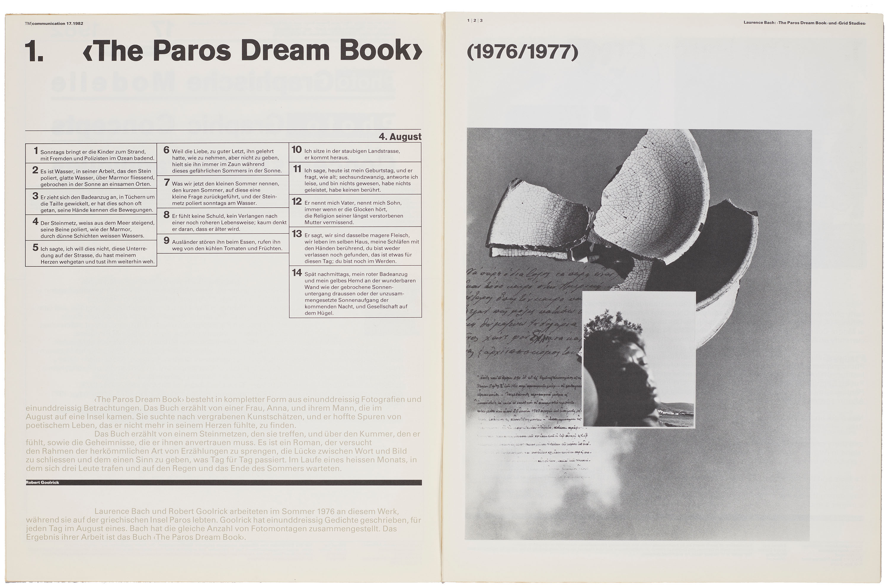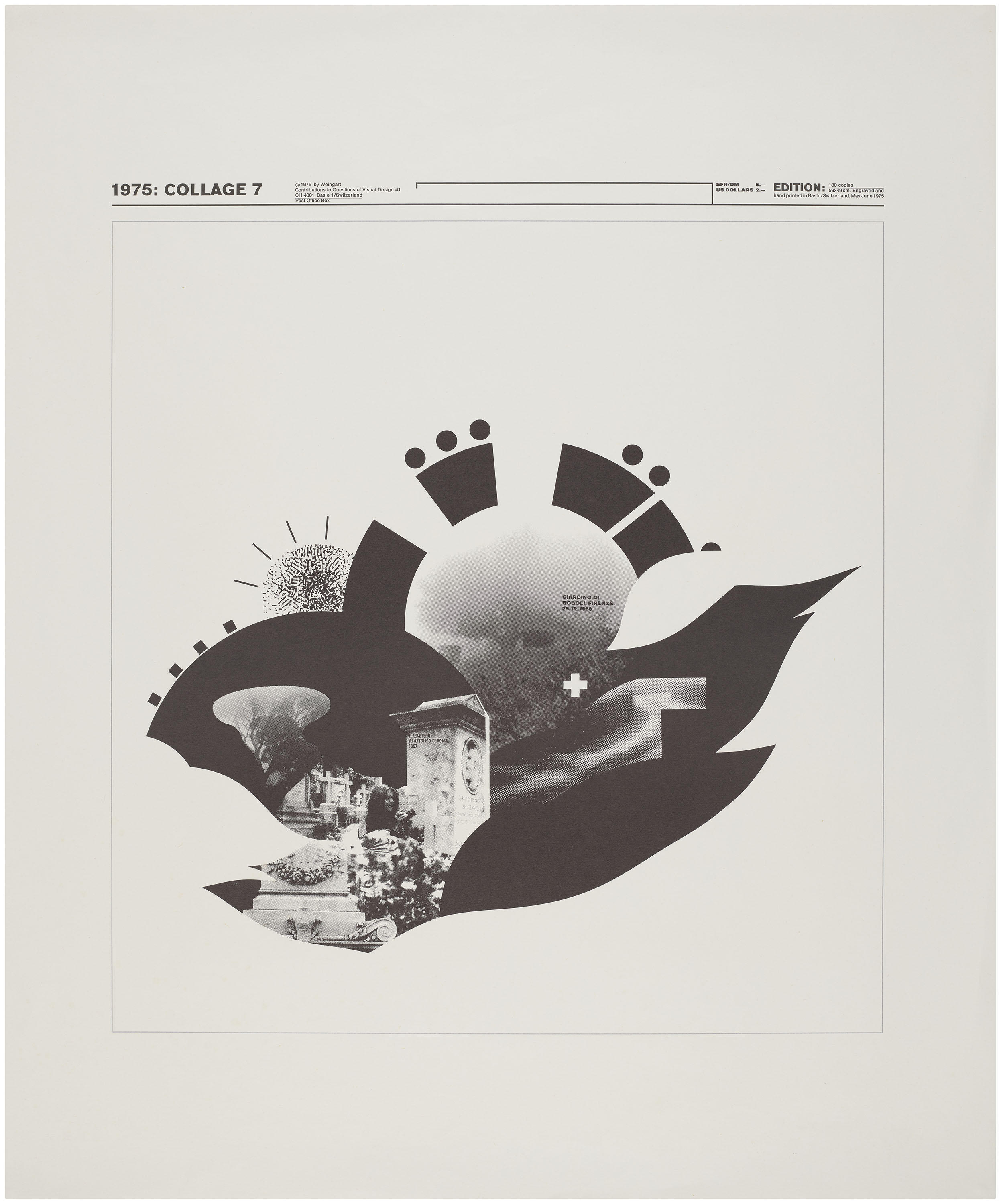 Departing from readability entirely, the design of the 1976 supplement is less concerned with clarity than with cultivating an atmosphere that captures the depth and feeling of Weingart’s work. Unlike earlier “Pioneers” issues, the images are not presented as a proper gallery but woven into multilayered compositions that emerge as works in their own right. Weingart’s use of photomontage resembles the visual conventions later associated with digital design, yet these compositions were produced entirely through the complex layering of photographic films.