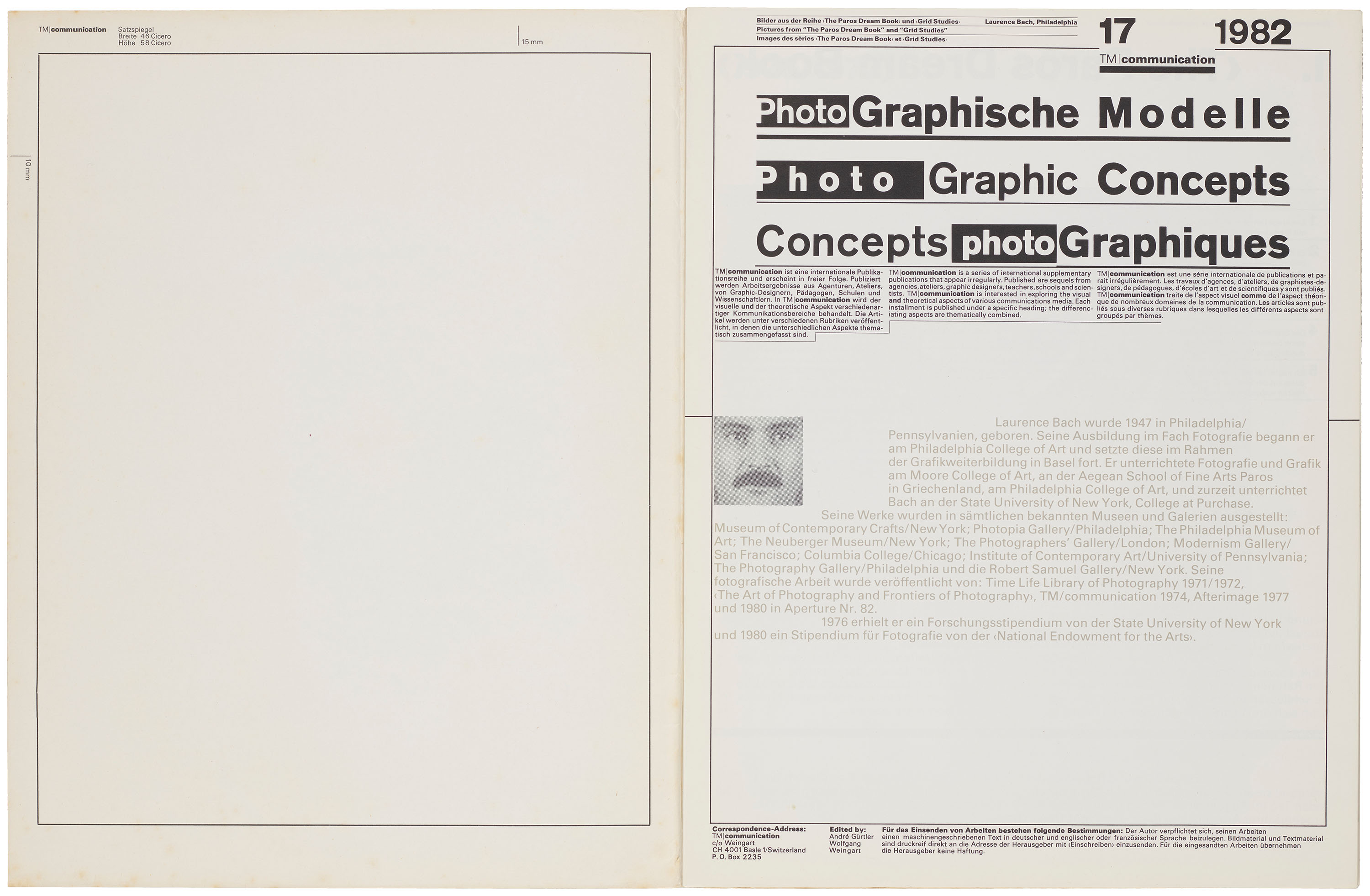 Donated to Letterform Archive by Weingart’s former student Jim Farris, a portfolio of process materials from an applied research project for the April 1979 issue of TM reveals the extent of these experiments. The collection includes numerous maquettes, paste-ups, and photofilms that provide an insightful look at the transformations of image and text made possible by the darkroom. Often collaborating closely with students, and at times presenting their work within layouts of his own design, questions of Weingart’s authorship are not always easily resolved.