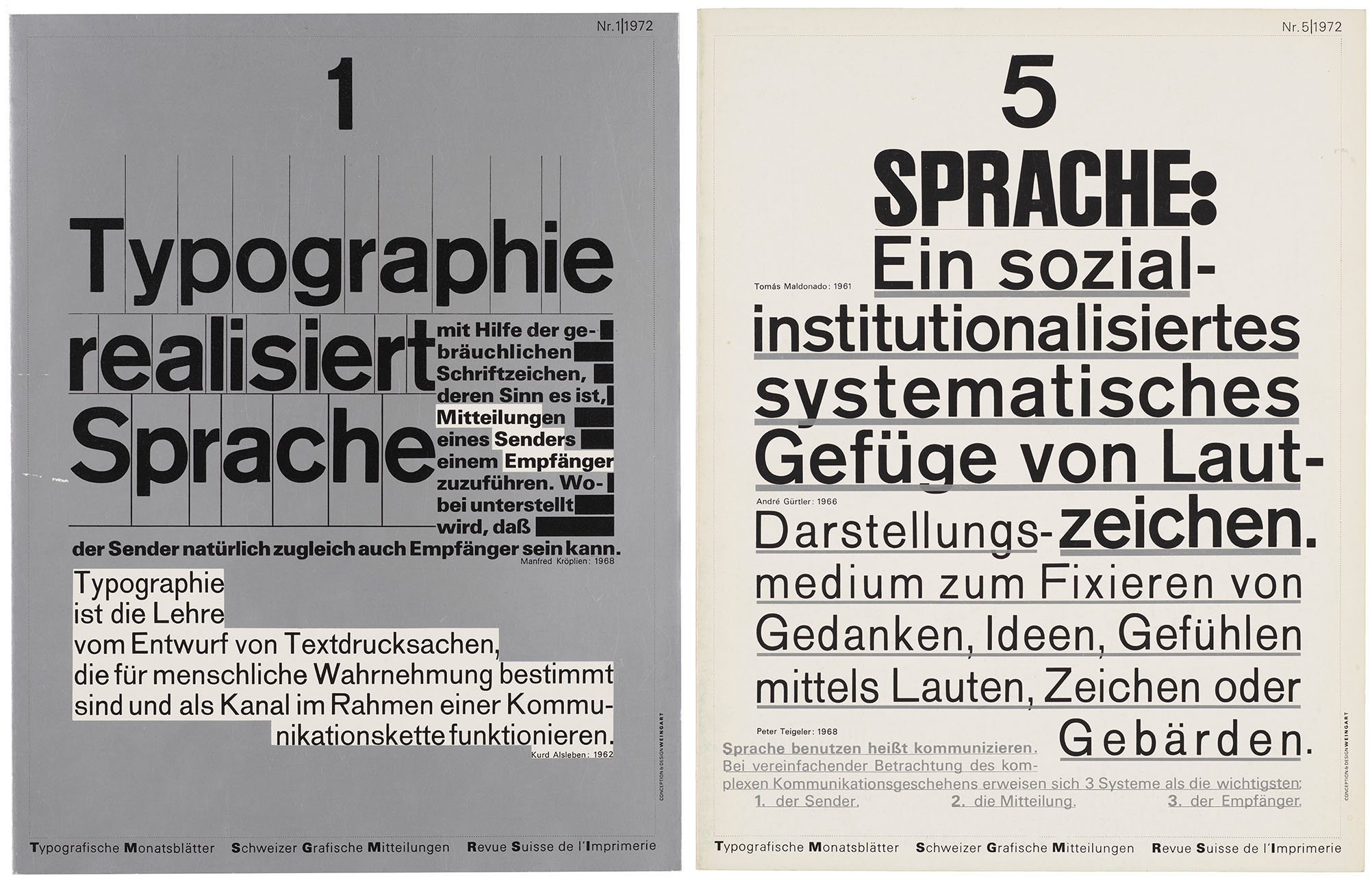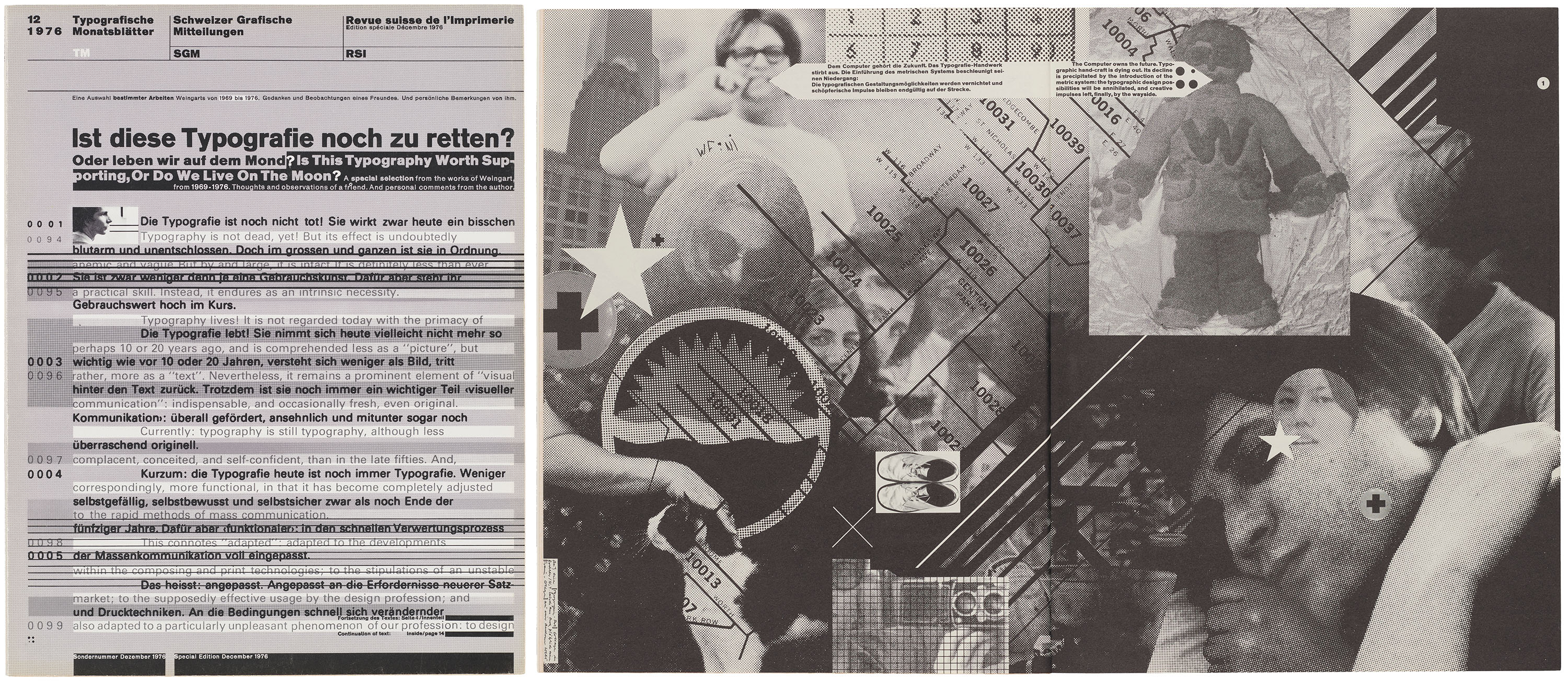 Produced under Weingart’s supervision, the December 1976 issue of TM marks the culmination of his early years as editorial board member, and retroactively frames the “Pioneers of Graphic Design” supplements (discussed here) as a legitimate series rather than a collection of disconnected editorials. Positioning him in the lineage of Swiss typography’s most prominent figures, the issue establishes Weingart as the reluctant inheritor of the Swiss design tradition.