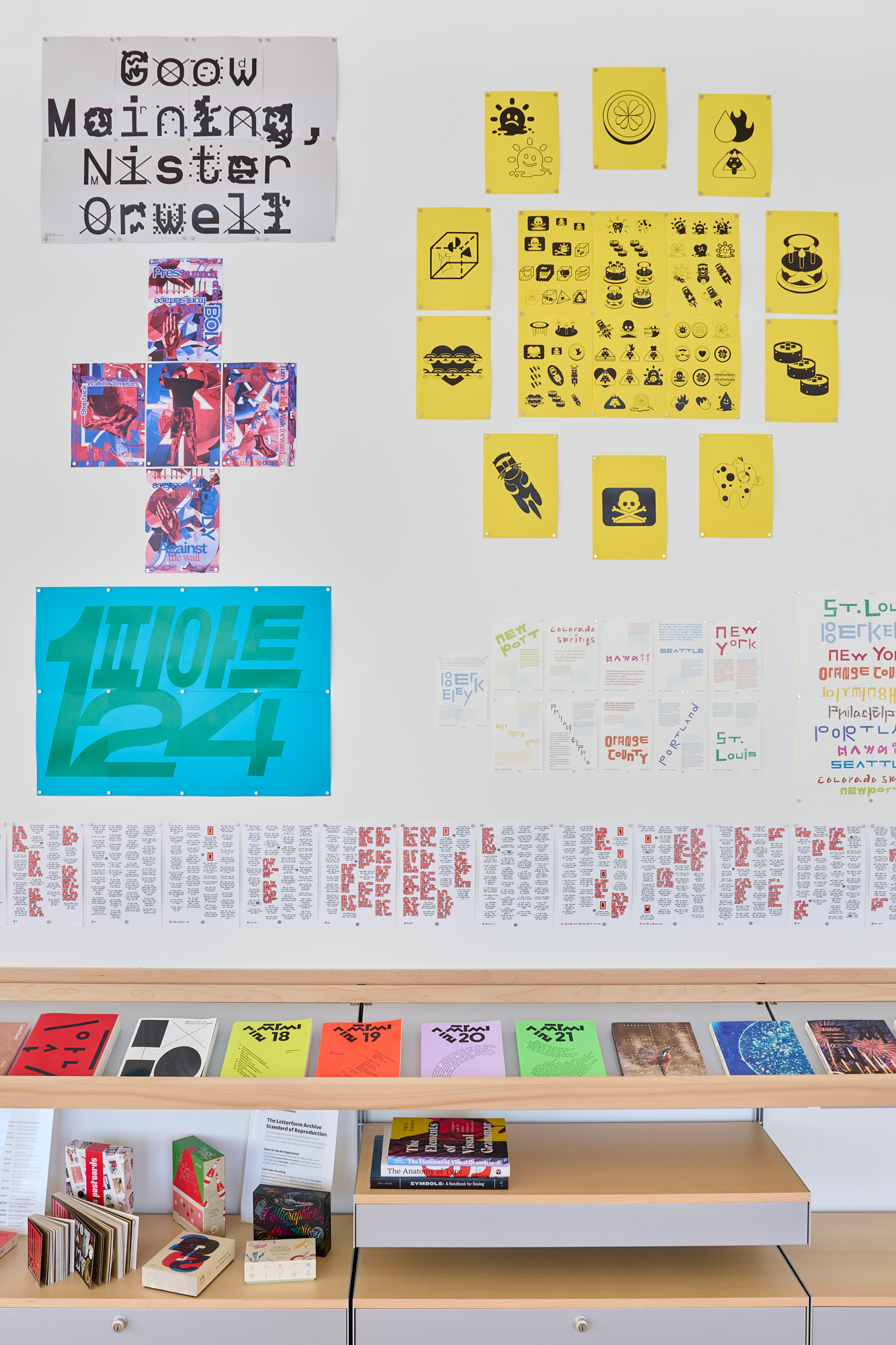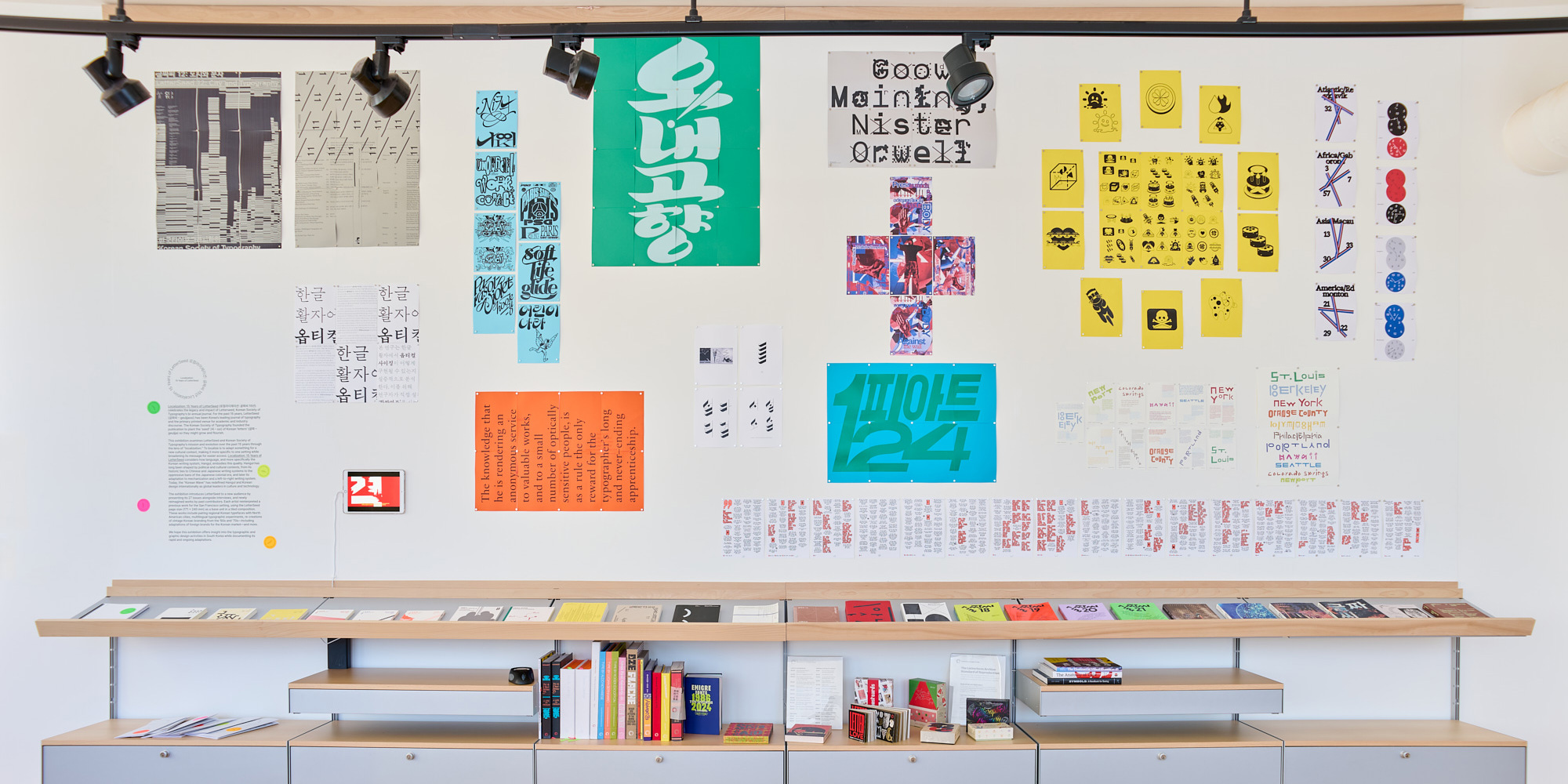 Letterform Archive’s reading room now serves as a display case for small, short-run exhibitions. Our third show, Localization: 15 Years of LetterSeed, opened this week and runs through the fall. It explores the rich typographic landscape of Korean typography and specifically Hangul, the unique writing system of the Korean language, through the lens of a single publication, LetterSeed, which has been published by the Korean Typographic Society since 2010.