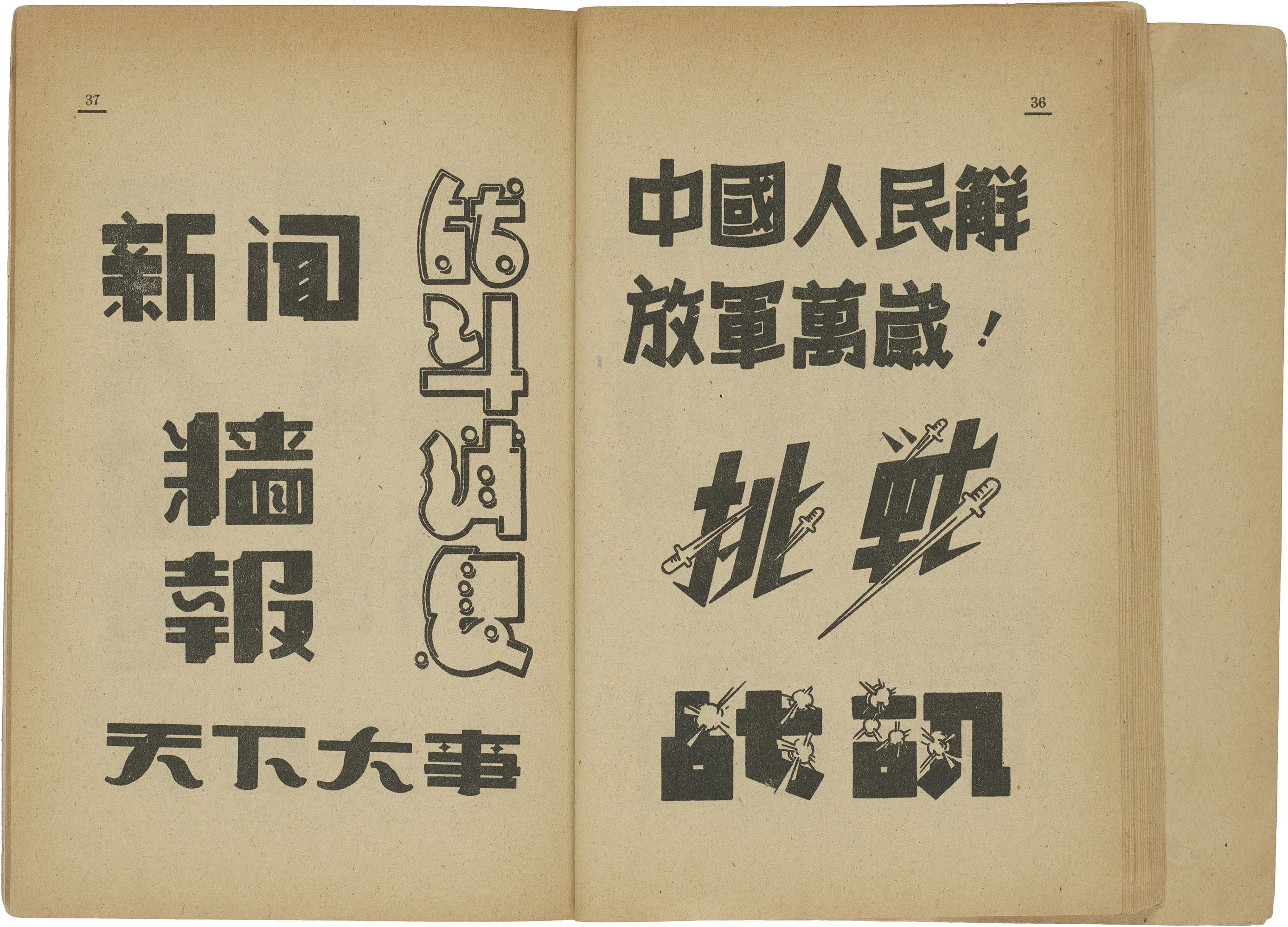 If the ancient traditions of calligraphy represented the classicism of Chinese culture practiced by an elite literati, then meishuzi, informed by commerce and a non-traditional set of tools, represented an emergent modern, popular consciousness. The first wave of meishuzi, moderated by commercial artists, was directed towards a mass audience, eventually paving the way for a second wave where the public began to assume creative agency. Written at the conclusion of the Second Sino-Japanese War, one manual from 1948 provides an almost mythological origin story of meishuzi as the product of resistance artisans that fanned a democratic revolution against the invading Japanese.10 Another manual proclaimed that old meishuzi was associated with the whims of capitalism that hijacked words for visual play, producing strange forms unhealthily divorced from their true application of enhancing a message. Departing from its commercialized past, new meishuzi needed to serve workers, peasants, and soldiers.11