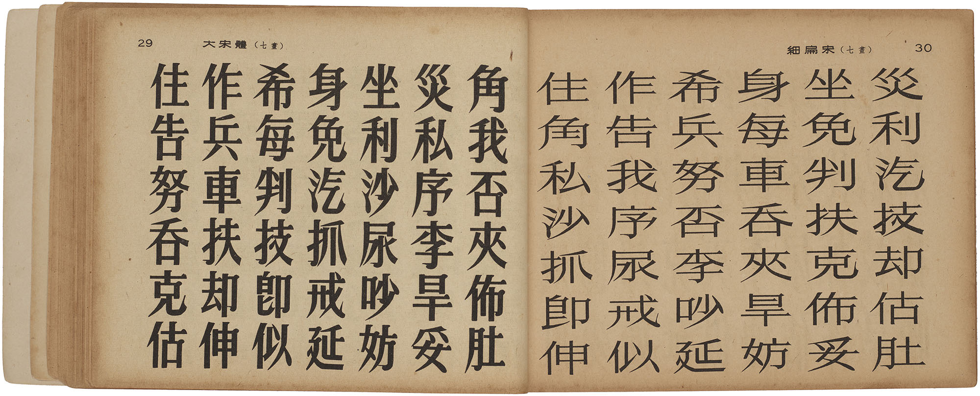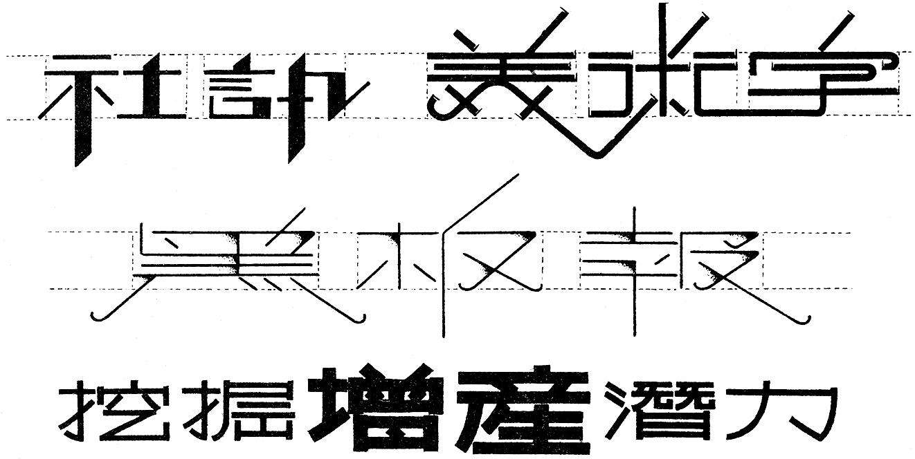 Through the 1950s, there was an increased emphasis on using printed type—particularly songti—as the foundation for the creation of meishuzi’s typographic form. Being the first style of printed type that evolved during the Song Dynasty, songti occupies a special place in Chinese print history. Maturing from the eleventh to the sixteenth century, songti emerged from a calligraphic style called “regular script,” and is characterized by a rectilinear structure of thick verticals and thin horizontals with triangular terminals. Historically, it has defined the textual appearance of books and continues to enjoy widespread use across the Sinosphere. Despite its popular appeal, many Chinese literati considered songti to be an inferior style made by illiterate and semi-literate craftsmen and criticized its harsh appearance and lack of graceful movement conveyed by traditional calligraphy.