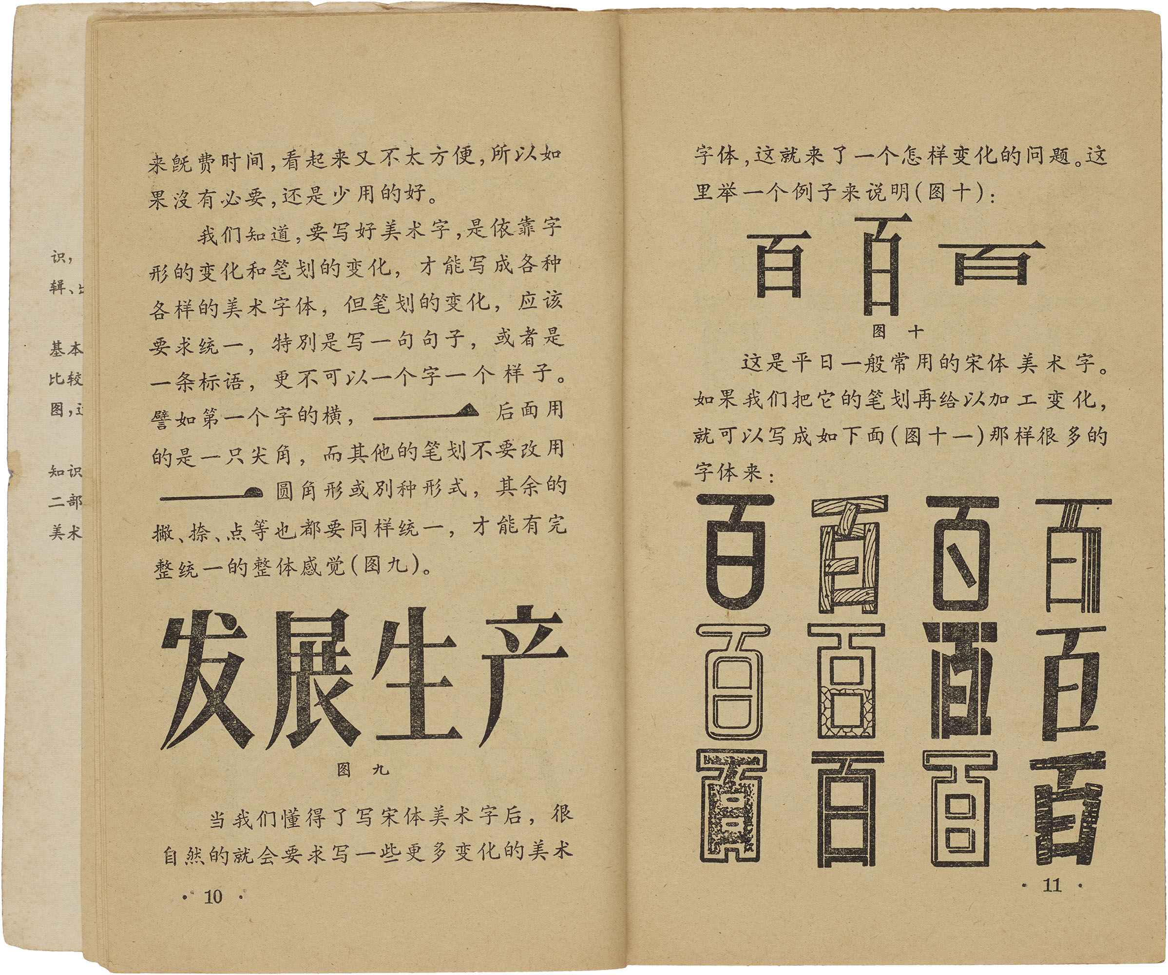 Freewheeling meishuzi experiments in the early decades of the twentieth century quickly yielded to the codified approach of the ’50s. By then, manuals primarily emphasized the creation of letterforms through the decoration, modification, and even addition and removal of strokes. While the possibilities for play were endless, the resulting forms were strikingly consistent thanks to the emphasis on using songti as their starting point. The focus on recognizability derived from established calligraphic forms ensured that the structural bones of the letterforms were the same even if they wore different clothes.9