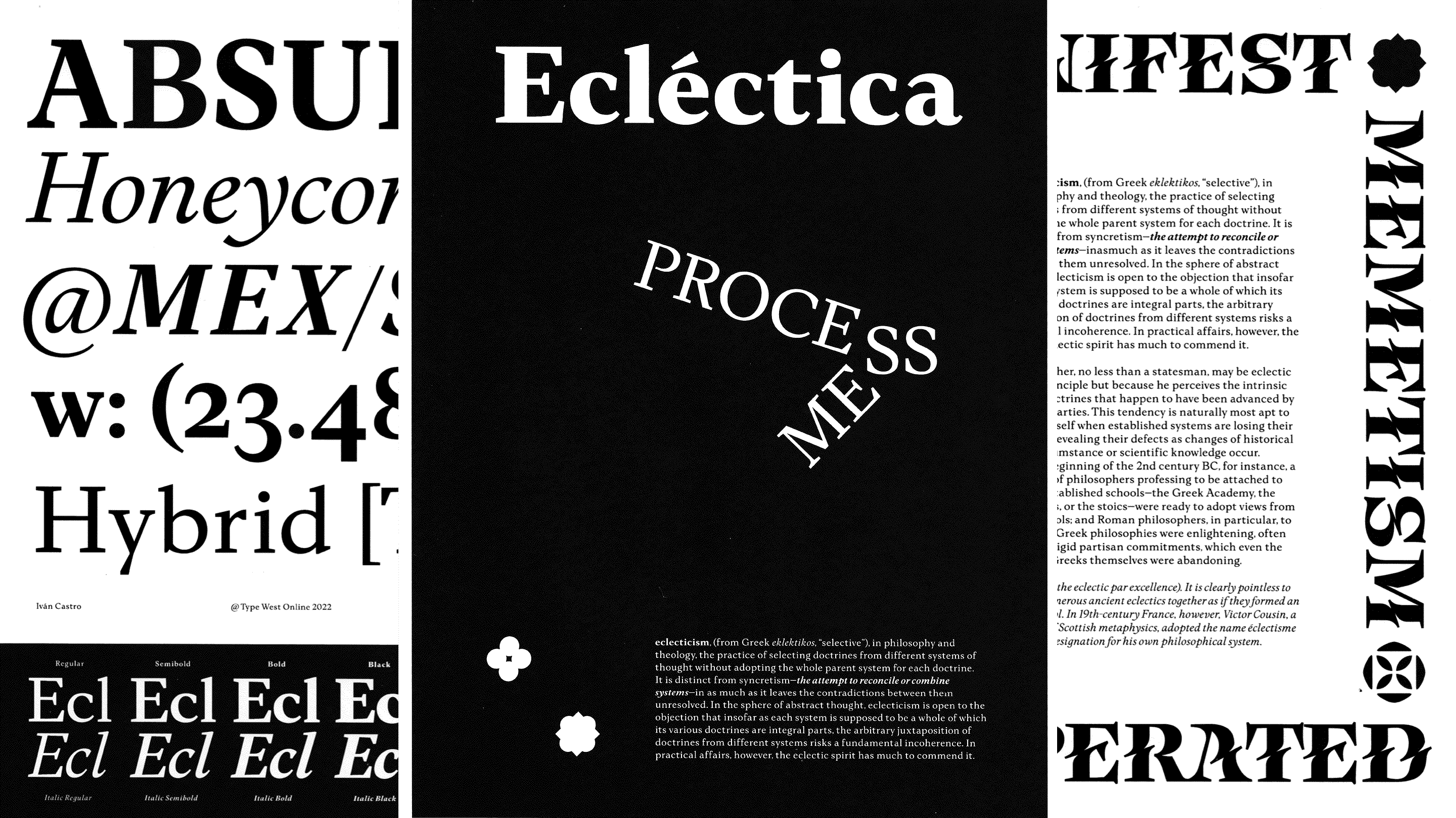 Iván Castro completed Type West Online 2022 from El Salvador, and has since dedicated his practice to shaping typefaces and typographic concepts that balance precision and personality. His Type West project Ecléctica was picked up by the Sudtipos foundry. He is also the co‑founder of Cabinete, a design collective aimed at creating a platform for Central American type and typographic projects.