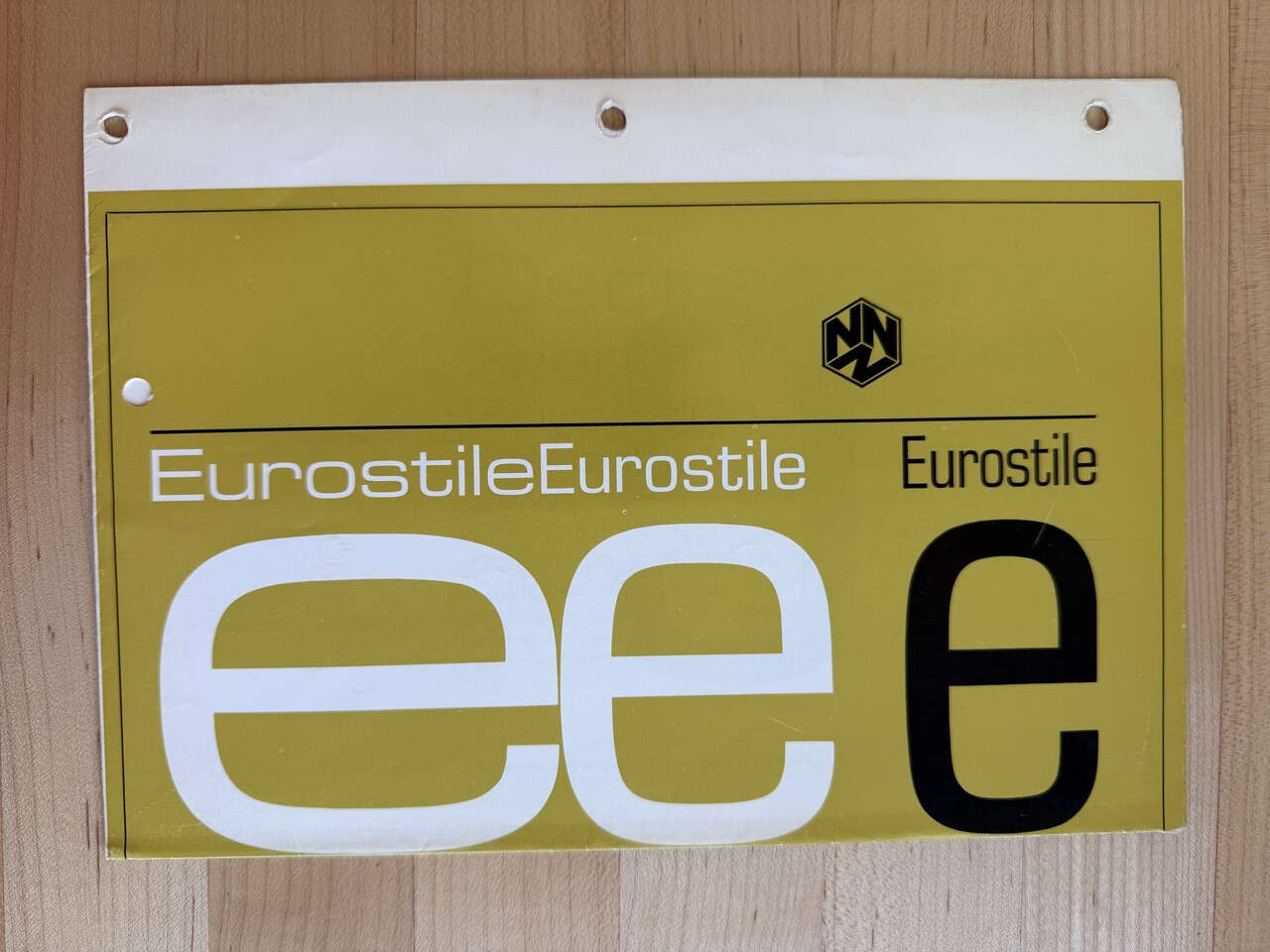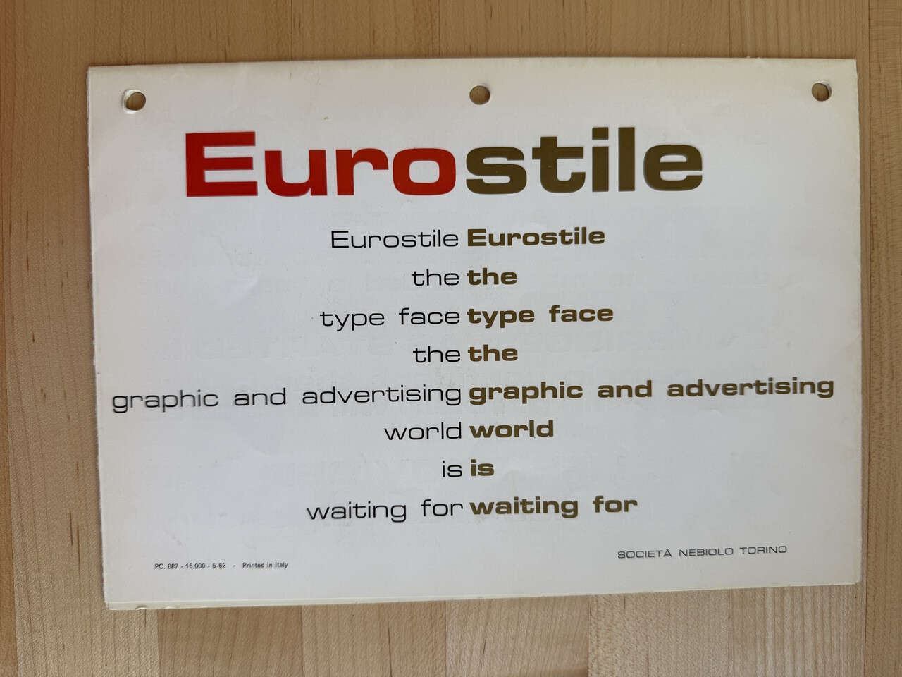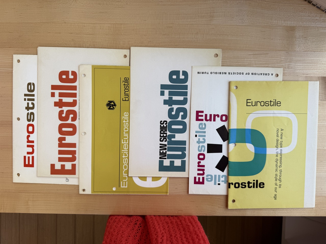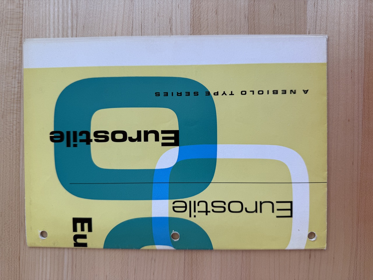 Lot of six folded leaflets advertising Eurostile to the US market via distribution of Amsterdam Continental. Most, if not all, designed by Aldo Novarese. Learn more from our facsimile publication, Type by Aldo Novarese.