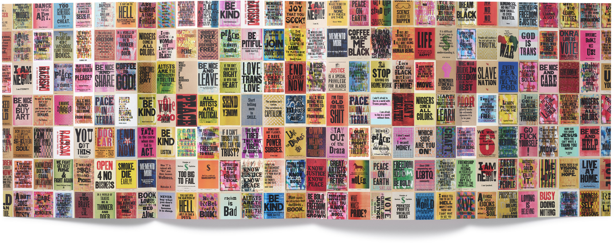Amos Paul Kennedy, Jr., was working a corporate job when, at nearly forty, he discovered the art of letterpress printing on a tour of Colonial Williamsburg. Kennedy then devoted himself to the craft, earning an MFA in graphic design at the University of Wisconsin–Madison. He now operates Kennedy Prints!, a letterpress printshop in Detroit. He has been featured in outlets like Hyperallergic, the New York Times, and the Economist, and he has exhibited in dozens of museums and galleries across the United States, including Poster House, the Brooklyn Public Library, the Library of Congress, and the libraries of the Museum of Modern Art and the Metropolitan Museum of Art.