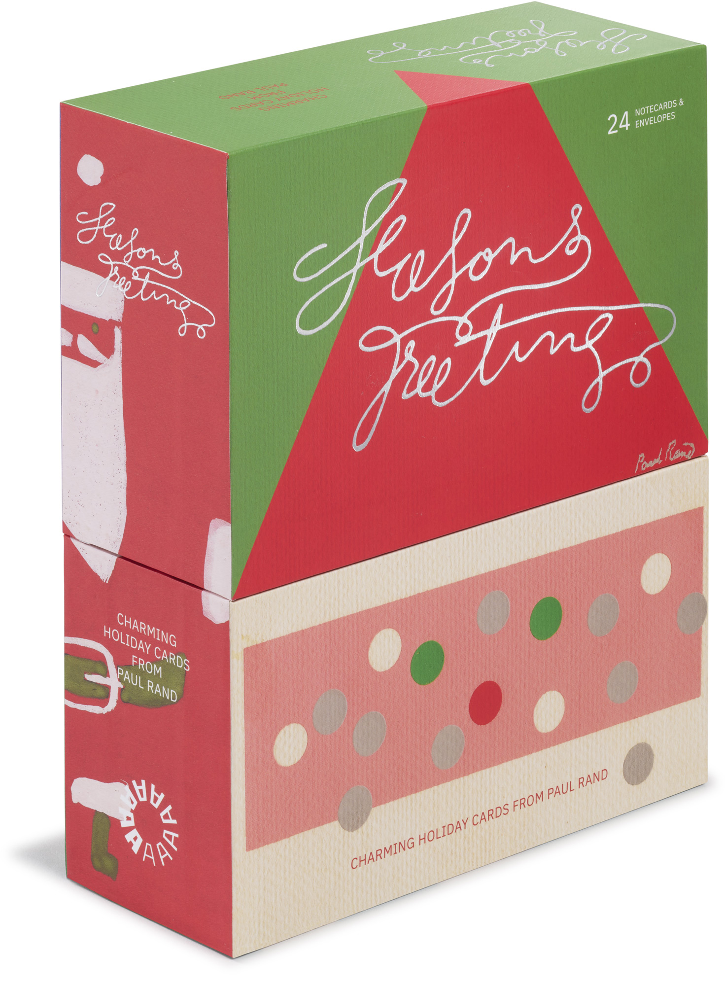 Legendary designer Paul Rand (1914–1996) is perhaps best known for his minimalist logos for companies such as IBM, UPS, and ABC. But he had a more whimsical side, as demonstrated in this collection of homemade Christmas cards. Some expressively painted, some collaged onto artboard, and others printed with die-cuts and folds, these creations show Santa cheerfully taking a snowball to the face, letting carolers read music off his beard, and lighting up like a Christmas tree in an X-ray booth—all in Rand’s playful yet iconic style. Reproduced in print for the first time, each of the dozen notecards appears twice, printed on textured paper and presented with envelopes in a keepsake box.