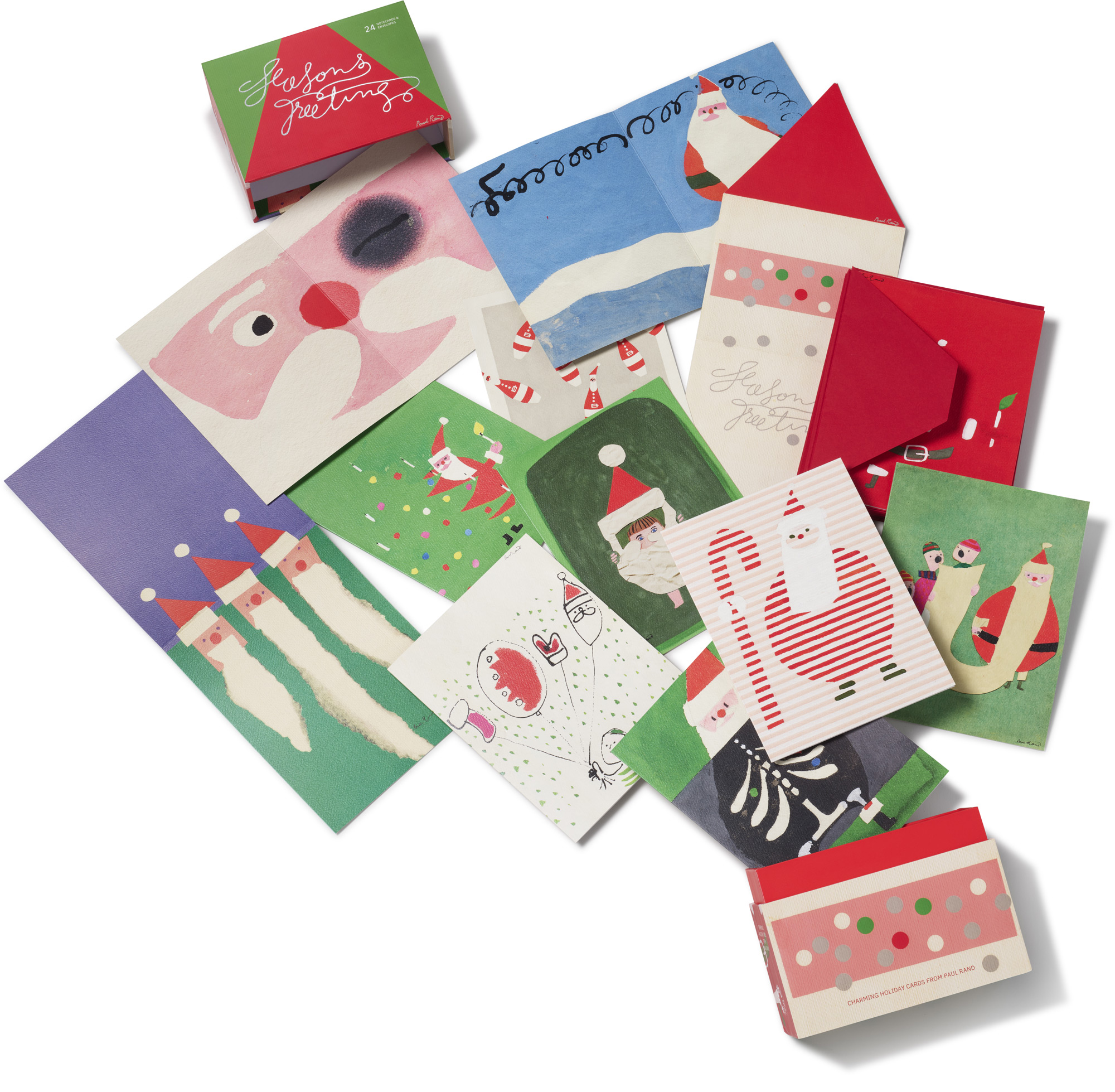 Twenty-four whimsical holiday cards featuring hand-drawn Santas from an American design titan