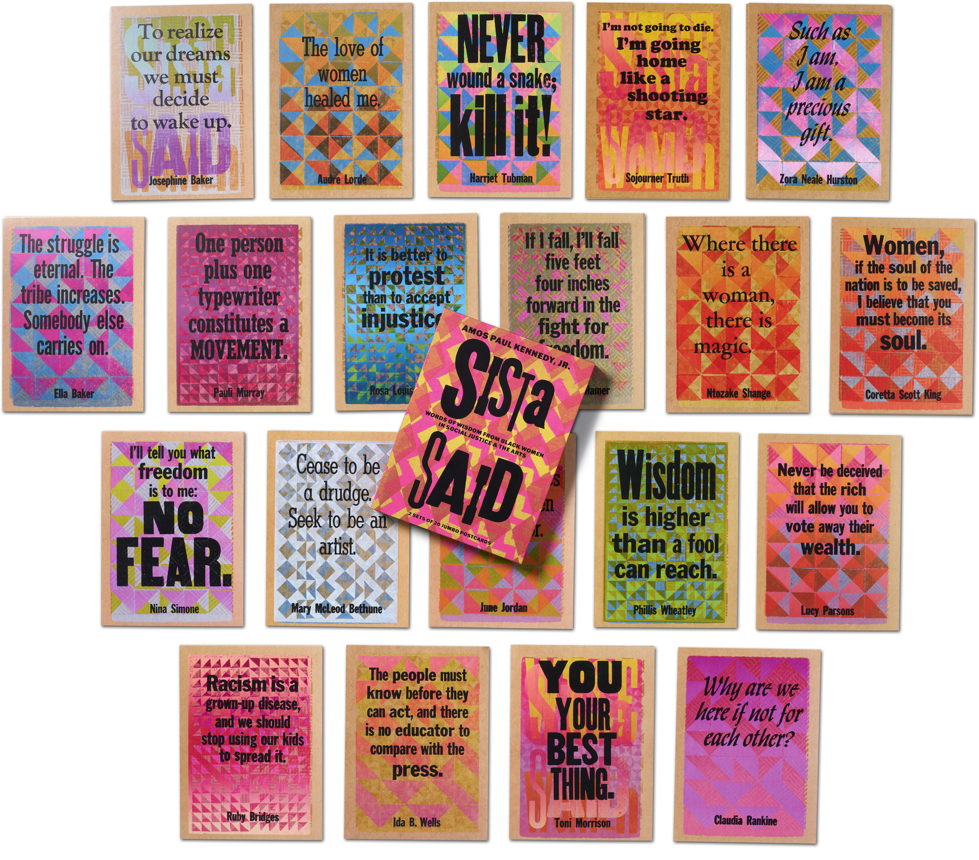 Vibrant postcards from letterpress printer Amos Paul Kennedy, Jr., celebrating powerful words from Black women—from Sojourner Truth to Rosa Parks, from Harriet Tubman to Nina Simone.
