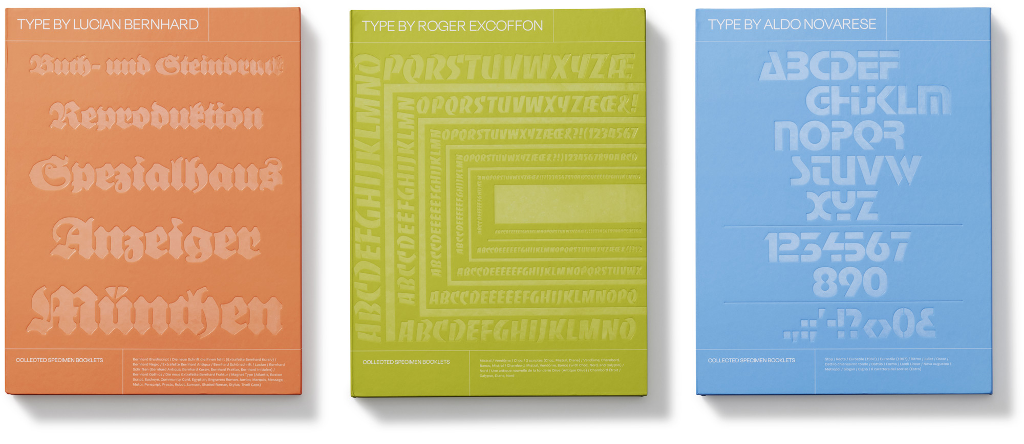 A bundle of volumes compiling facsimiles of typeface specimens from Lucian Bernhard, Roger Excoffon, and Aldo Novarese. Get all three at once and save!